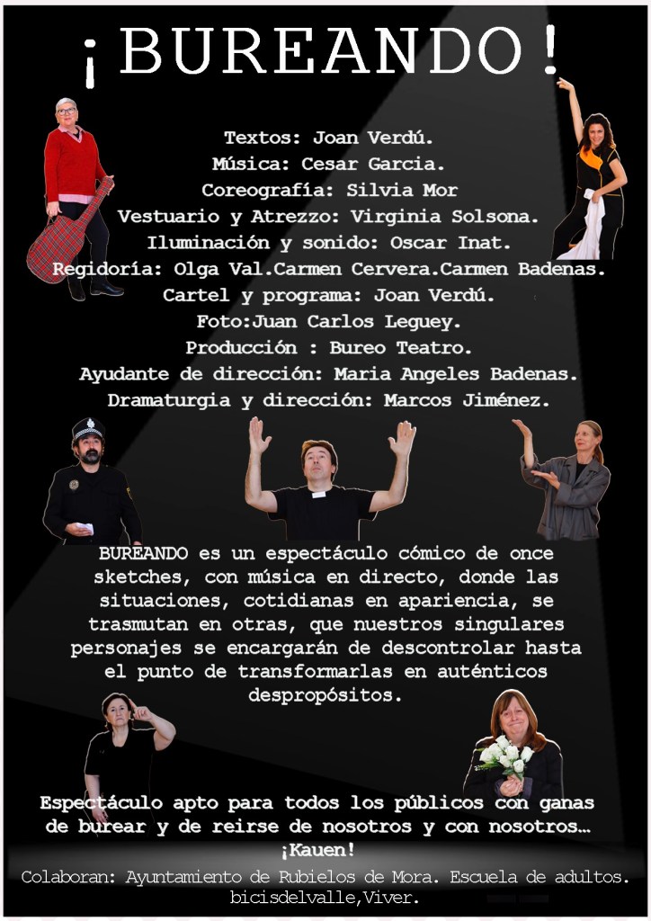 Bureando es un espectáculo cómico de once sketches cortos con música de en directo con textos de Joan Verdú y dramaturgia de Kauen Teatre que siguen un particular orden cronológico. Las situaciones cotidianas en apariencia, propuestas por nuestros actores y actrices se trasmutan en otras que nuestros singulares personajes se encargarán de descontrolarlas hasta el punto de transformarlas en auténticas locuras. Partiendo l principio filosófico-popular “hoy hace un día magnifico, ya verás como viene alguien y lo jode. En el Bureo nos reímos y esperamos también con vosotros. Apto para todos los públicos con ganas de reírse. Kauen!